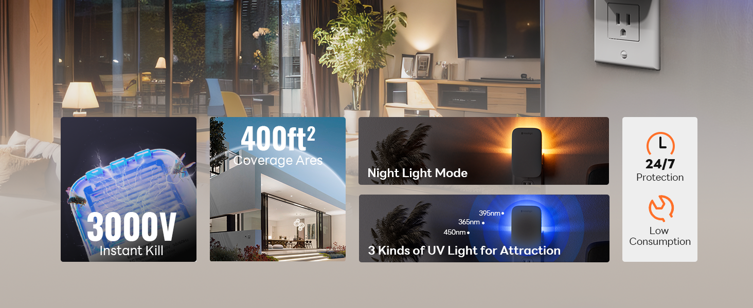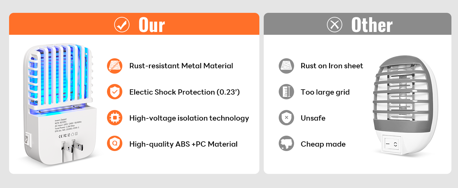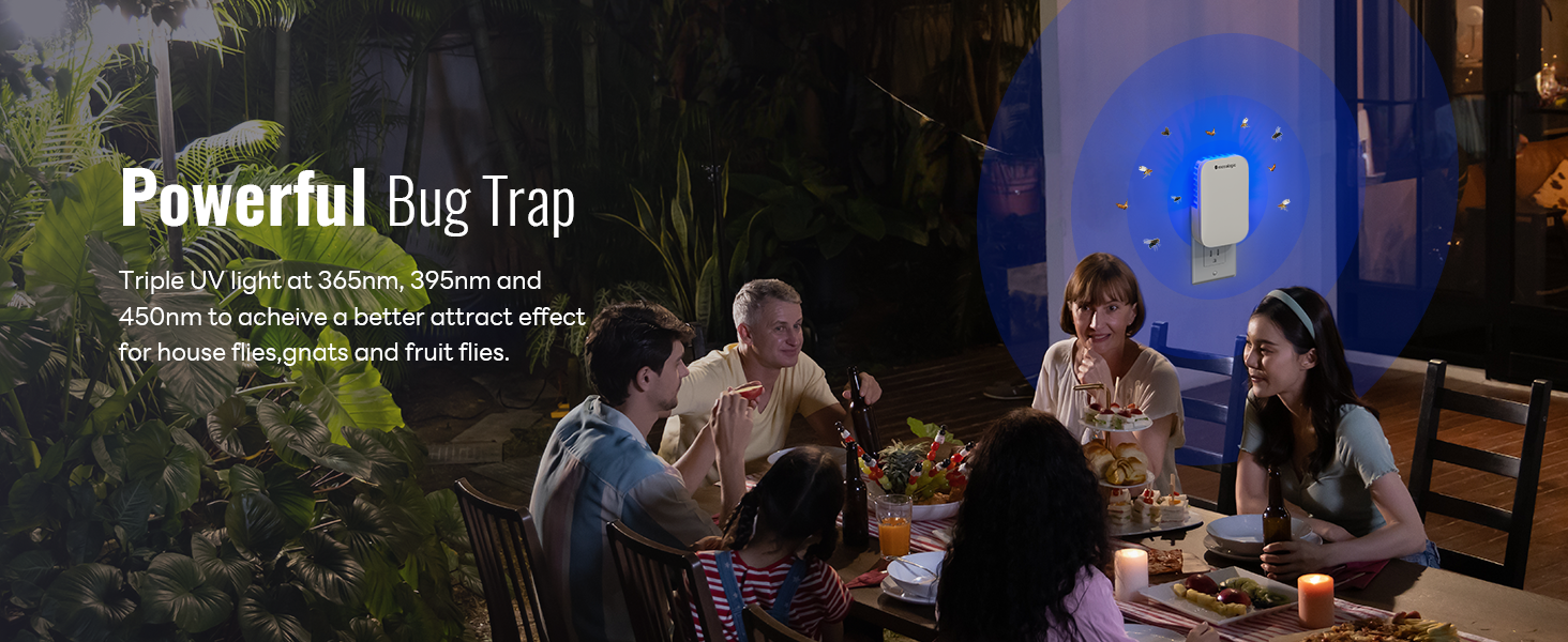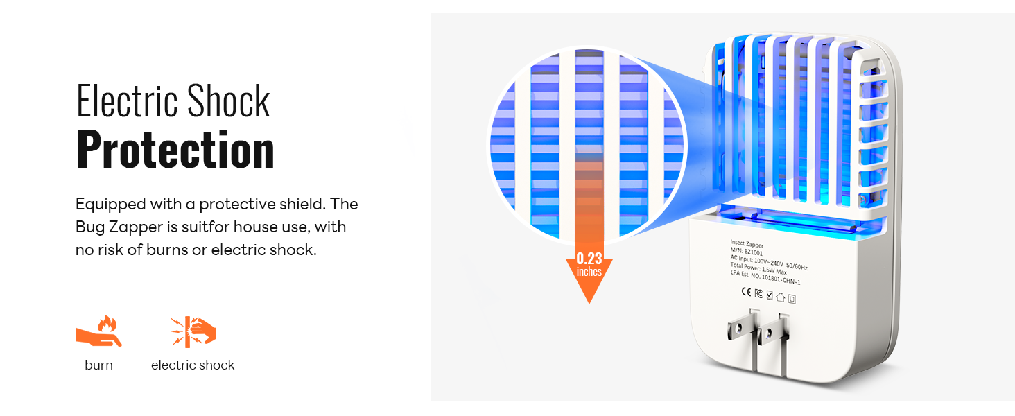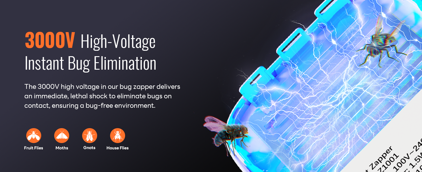 A. The principle is to make use of the phototaxis of flying insects. Applied 365nm, 395nm, and 455nm UV light as attractants. Once in contact, the bug zapper emits up to 3000V of high voltage to kill them.