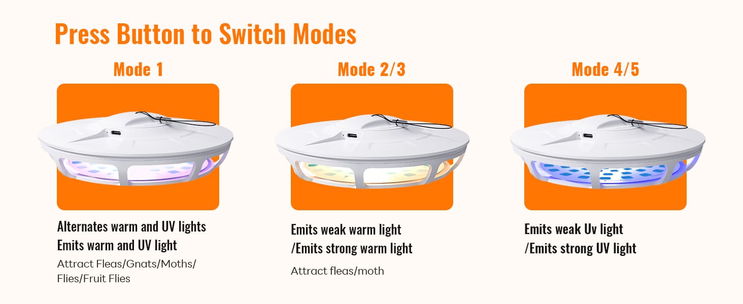 • Modes 2-3: Warm yellow light for fleas, moths & mites