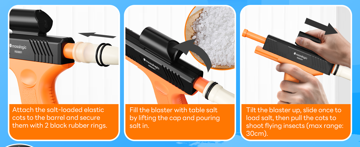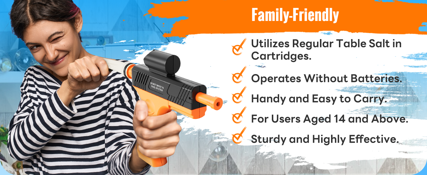 The ultimate non-toxic pest control solution that makes eliminating flies easy, effective, and even fun! Perfect for indoor and outdoor use, this advanced salt blaster targets soft-bodied insects with precision — all without chemicals or batteries.