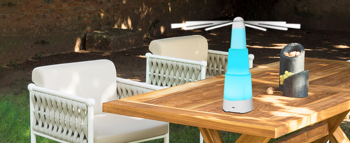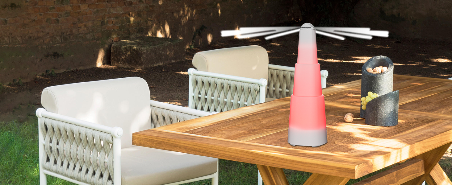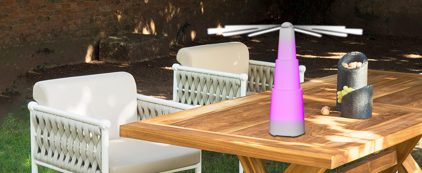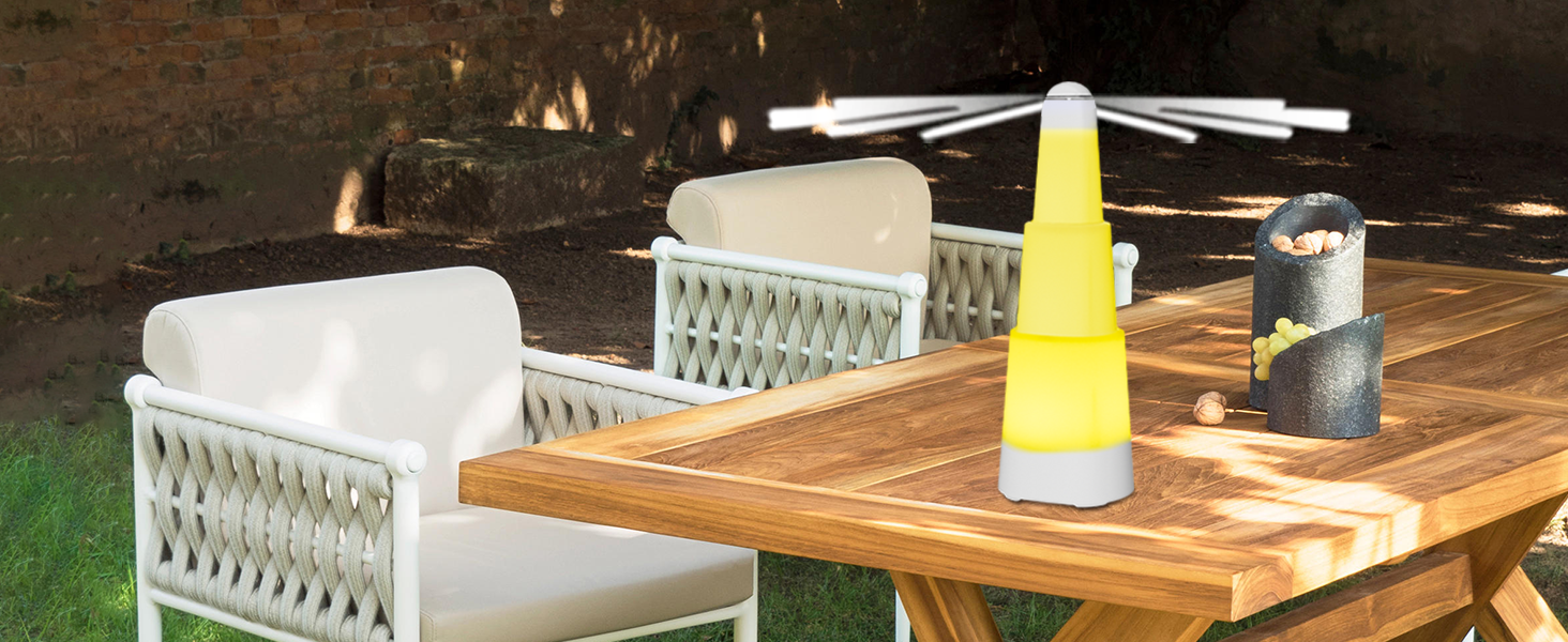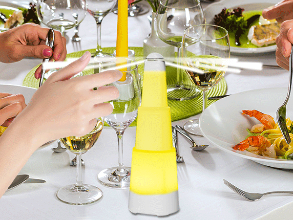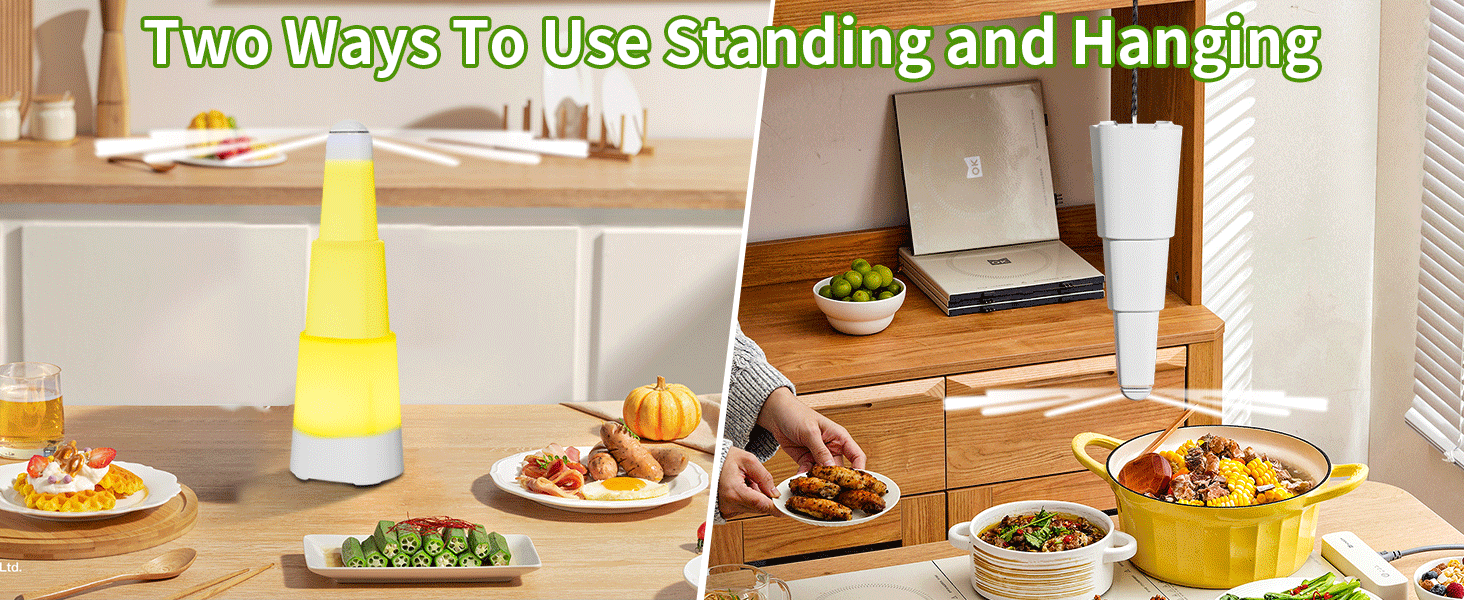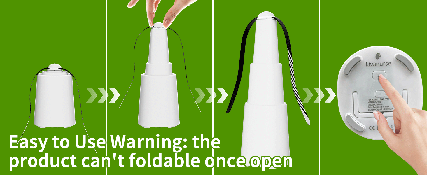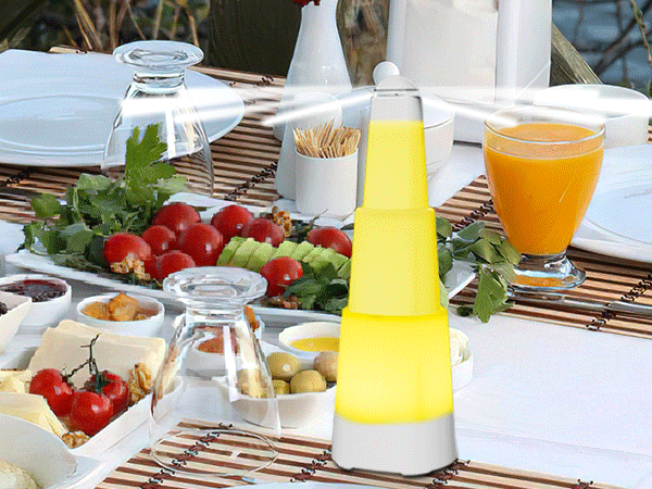 This device is designed to repel flies from your table. The rotating wings simulate a threat to flies, deterring them from the area. It can be used either flat on the