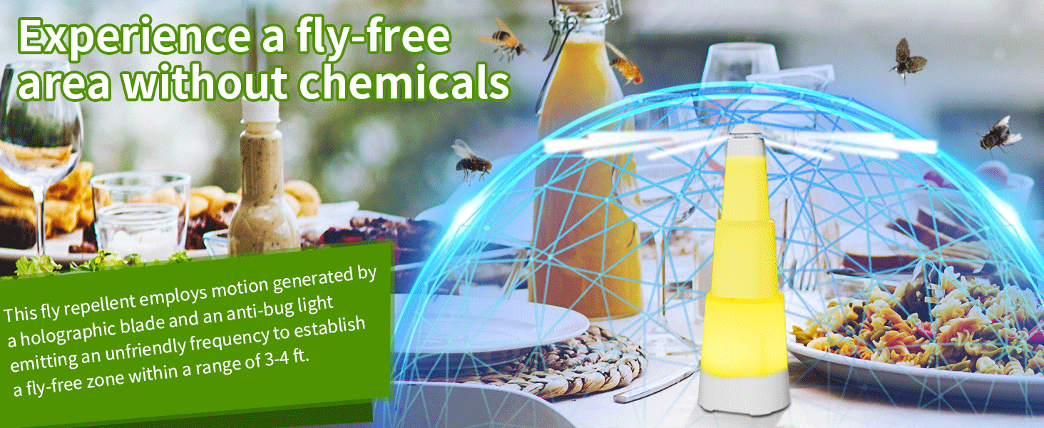 - [Innovative Dual-Deterrence Fly Fan] - The blades feature a holographic dot pattern, bending and refracting light as they spin. Coupled with its Anti-Bug Light, this device effectively repels flies and bugs. Unlike standard tabletop fly spinners, this unique device boasts XL holographic blades and engineered anti-bug amber lights for superior efficiency. It utilizes motion and light to deter flies effectively
